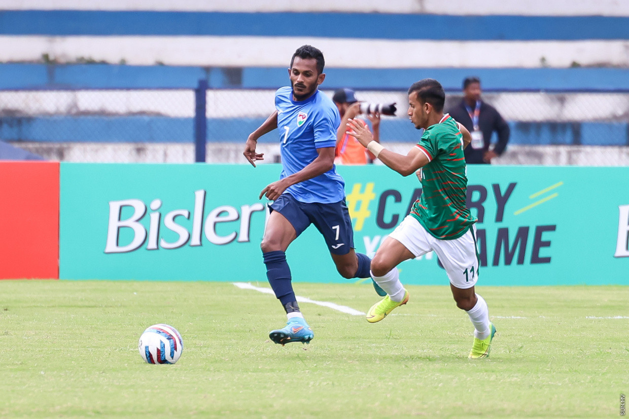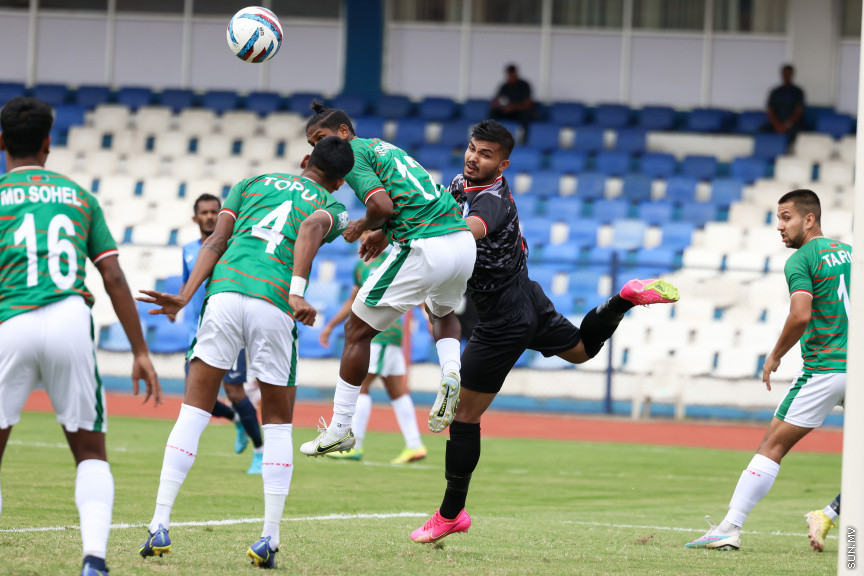 ސާފް ޗެމްޕިއަންޝިޕް 2023 ގައި ރާއްޖެ އާއި ބަންގުލަދޭޝް ބައްދަލުކުރި މެޗުގެ ތެރެއިން -- ސަން ފޮޓޯ/ އަބްދުﷲ އަބީދު