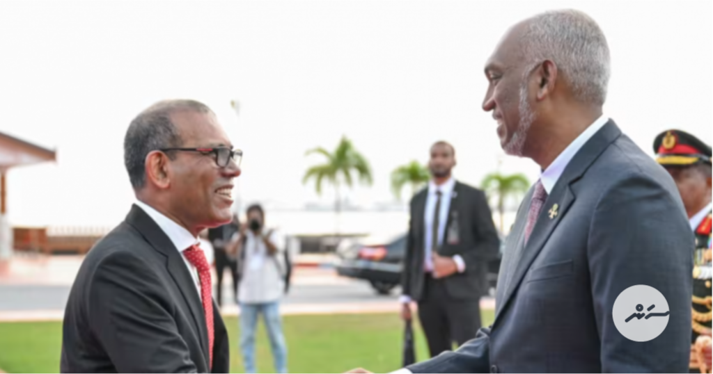 މާލީ ވަޒީރު މޫސާ ޒަމީރާއި، ރައީސް ޑރ. މުޙައްމަދު މުއިއްޒާއި، ފޮރިން މިނިސްޓަރު އަބްދުﷲ ޚަލީލް: މި ސަރުކާރަށް ދިމާވެފައިވާ ގޮންޖެހުންތަކާއެކު ވެސް ދަރަނި ދެއްކޭނެ ކަމަށް ސަރުކާރުން ބުނޭ -- ފޮޓޯ: ރައީސް އޮފީސް