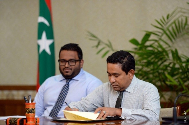 ކުރީގެ ރައީސް އަބްދުالله ޔާމީނާއި ކުރީގެ ނައިބު ރައީސް އަޙްމަދު އަދީބު-- ފޮޓޯ/ ރައީސް އޮފީސް