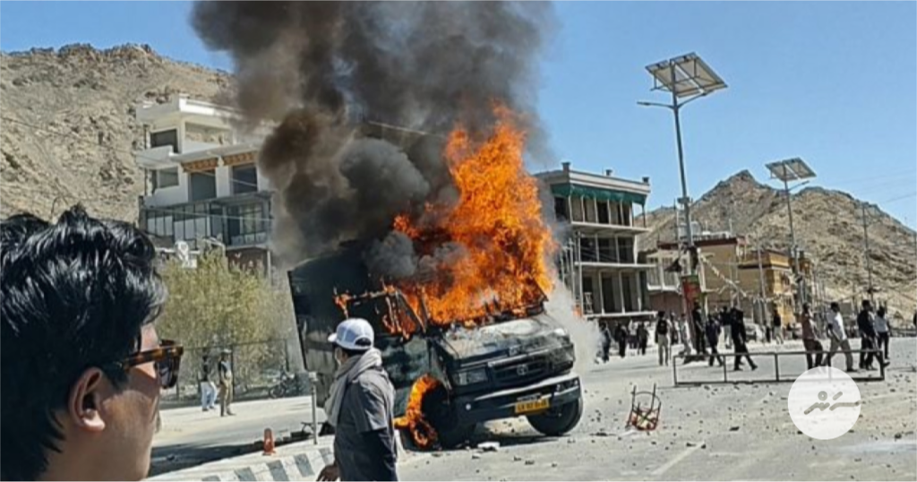 މުޒާހަރާ ހޫނުވީ މުޒާހަރާގެ ބައިވެރިން ލަދާކްގެ މައި ސިޓީ ލެހުގައި ފުލުހުންނާ ކުރިމަތިލައި އަސްކަރީ ވެހިކަލަކާއި ވެރިކަންކުރާ ބާރަތިޔާ ޖަނަތާ ޕާޓީ (ބީޖޭޕީ)ގެ އޮފީހުގައި އަލިފާން ރޯކޮށްލުމުންނެވެ.