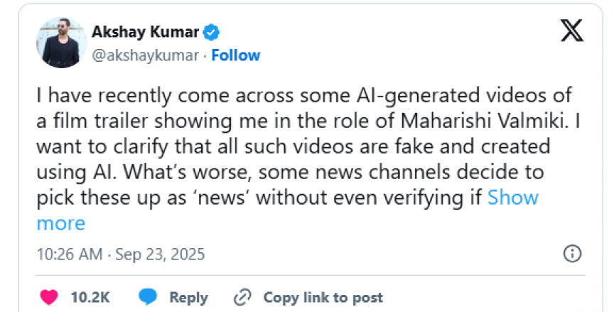 އެކަން އެކްސްގައި ދޮގުކުރަމުން އަކްޝޭ ބުނެފައިވަނީ 'މަހާރިޝީ ވަލްމިކީ' ކެރެކްޓާގެ ނަމުގައި އަކްޝޭ އުޅޭ ކަމަށް ބުނެ އޭއައި ޖެނެރޭޓްކޮށް އުފައްދާފައިވާ ފިލްމެއްގެ ޓްރެއިލާއެއް ސޯޝަލް މީޑިއާގައި ދައުރުވަމުން އަންނަ ކަމަށް މައުލޫމާތު ލިބިފައިވާ ކަމަށެވެ.