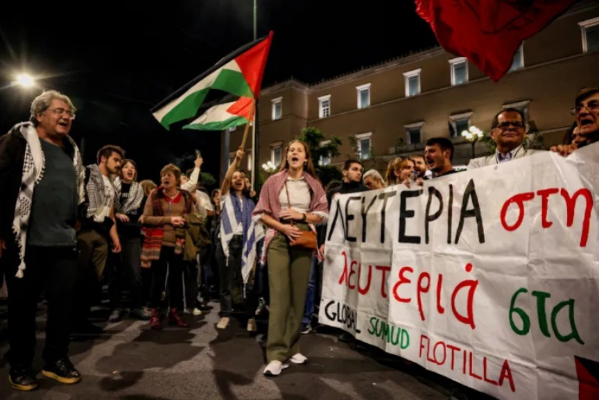 ފްލޮޓިލާގެ އުޅަނދުތަކަށް އިސްރާއީލު ސިފައިން އެރުމުން އެކަމާ ދެކޮޅަށް ގްރީސްގައި މުޒާހަރާ ކުރަނީ. ފޮޓޯ/ރޮއިޓާސް