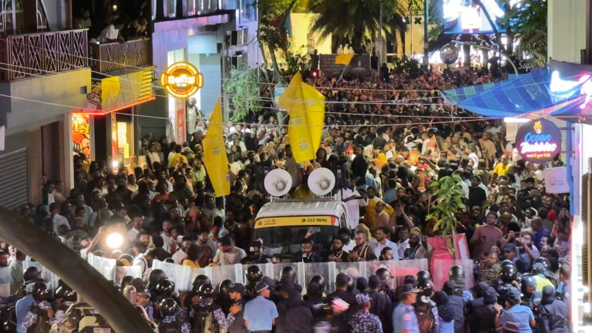 އެމްޑީޕީގެ މުޒާހަރާގެ ބައިވެރިން ހުއްޓުވާފައި ވަނީ، ފުލުހުން ހުއްދަ ދީފައިވާ މަގު ނޫން އެހެން މަގަކުން ދާން މަސައްކަތް ކުރުމުންނެވެ. ފުލުހުން އަންނަނީ މިއީ "ޣައިރު ގާނޫނީ'' އެއްވުމެއް ކަމަށް ބުނެ، ފަހަތަށް ޖެހެން އިންޒާރު ދެމުންނެވެ.