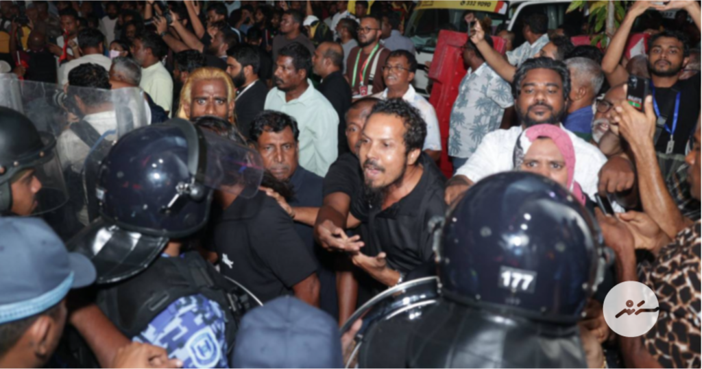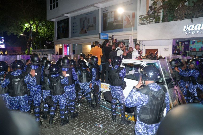 އެމްޑީޕީ ލޫޓުވައިފި މުޒާހަރާގެ ތެރޭގައި އެސްއޯ ފުލުހުން ހަރަކާތްތެރި ވަނީ: އިހުސާން ވަނީ، އެމްޑީޕީގެ މަގުސަދަކީ ސުލްހަވެރި ހަރަކާތެއް ބޭއްވުން ނޫންކަމަށް ބެލެވޭ ކަމަށް ވިދާޅުވެފައި ---- ސަން ފޮޓޯ/ އަހުމަދު ފިރްޔާލް