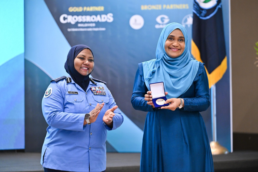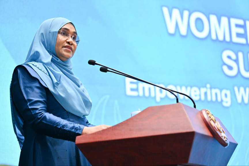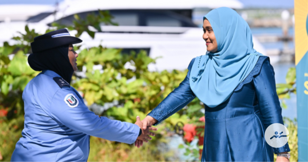 މޯލްޑިވްސް ވިމެން އިން ޕޮލިސް ޗެލެންުގެ ފައިސާ ފޮތި ސާޖިދާ ލޯންޗުކޮށްދެއްވުން: ވިދާޅުވީ، ގާނޫނު ނެގެހެއްޓުމުގައި އަންހެނުން ހިތްވަރުދޭ، ޔުނިފޯމުގައި ޚިދުމަތްކުރާ ދާއިރާތަކުގައި އެމީހުންގެ ދައުރު ތަފާތު ކަމަށް --- ފޮޓޯ/ ރައީސް އޮފީސް