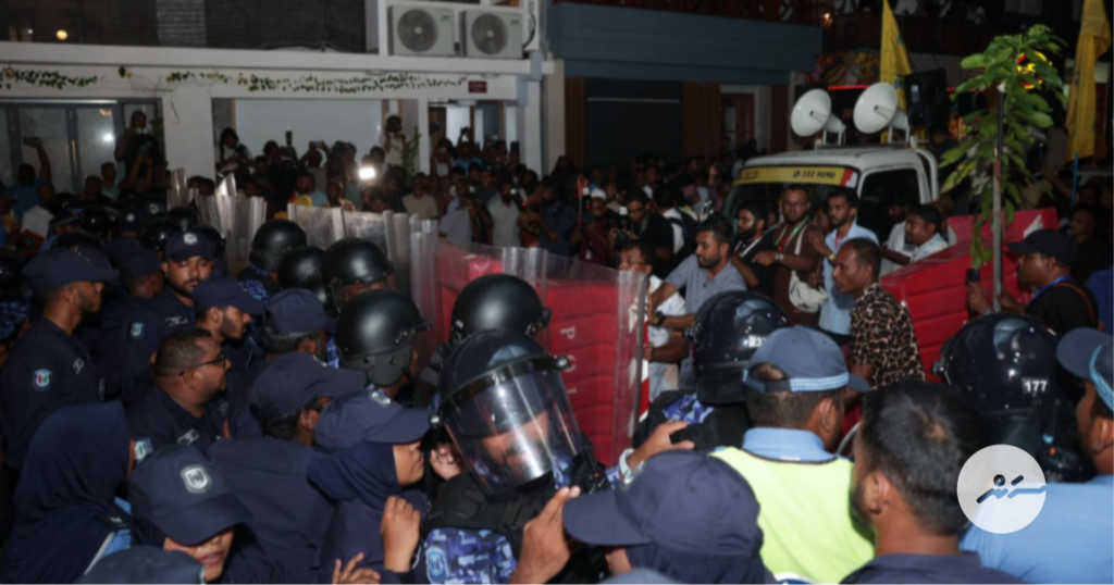 އެމްޑީޕީން ކުރިއަށް ގެންދިޔަ އެއްވުމުގެ ބައިވެރިން އާޓިފިޝަލް ބީޗުން ނުކުމެ، މަޖީދީ މަގަށް ނިކުތުމުން އެސްއޯ ފުލުހުން ވަނީ އެކަމަށް ހުރަސް އަޅާފައެވެ. އެއަށް ފަހު، އެއްވުމުގެ ބައިވެރިންނާ ދެމެދު ކުރިމަތިލުންތަކެއް ހިނގާފައިވާއިރު، ފުލުހުން ވަނީ ޕެޕާ ސްޕްރޭ ވެސް ޖަހައިފައެވެ. އޭގެ އިތުރުން، އެއްވުން ރޫޅާލުމަށް ޓަކައި ބާރު އަަޑެއް ފޮނުވައި ލޯންގް ރޭންޖް އެކޮސްޓިކް ޑިވައިސް (އެލްއާރުއޭޑީ) ވެސް ފުލުހުން ވަނީ ފުރަތަމަ ފަހަރަށް ބޭނުންކޮށްފައެވެ.