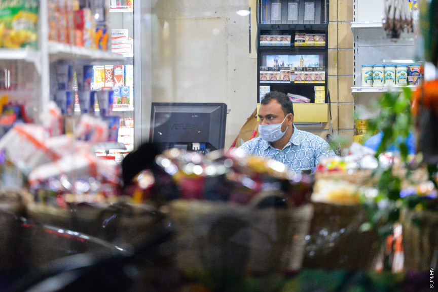 މީހަކު ފިހާރައެއްގައި މާސްކު އަޅައިގެން -- ސަން ފޮޓޯ/ ފަޔާޒު މޫސާ